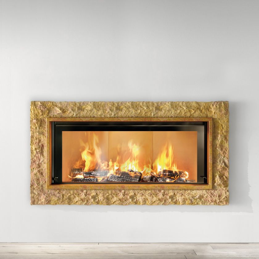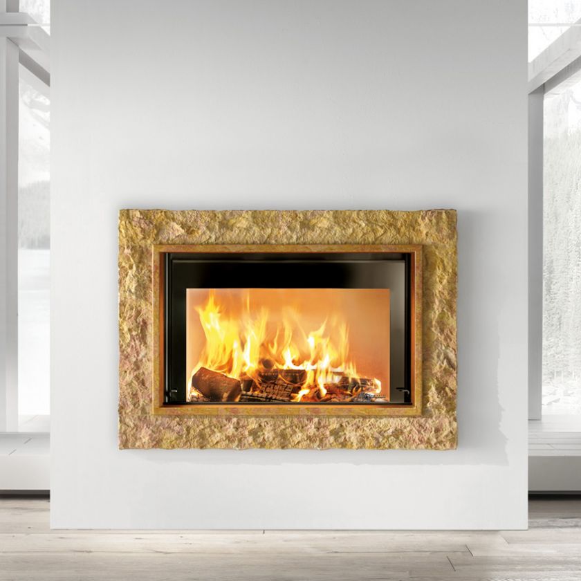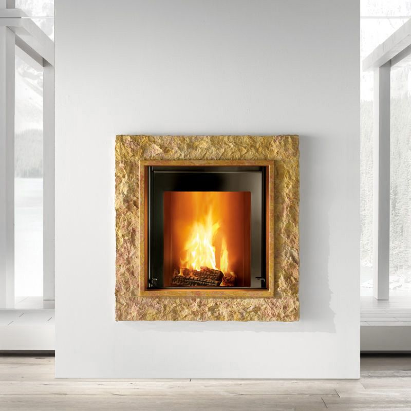 caminetto a legna con porta interamente in vetro ceramico, apertura a saliscendi e a ribalta per la pulizia. Camera di combustione rivestita in CMtech®, refrattario realizzato con spessori importanti; nella parte superiore il Catalizzatore-Frangifiamma è in CMtech®2, refrattario ceramico. Il caminetto può essere completato con due kit opzionali per distribuzione dell’aria calda sia nella versione naturale che ventilata.