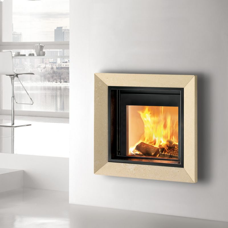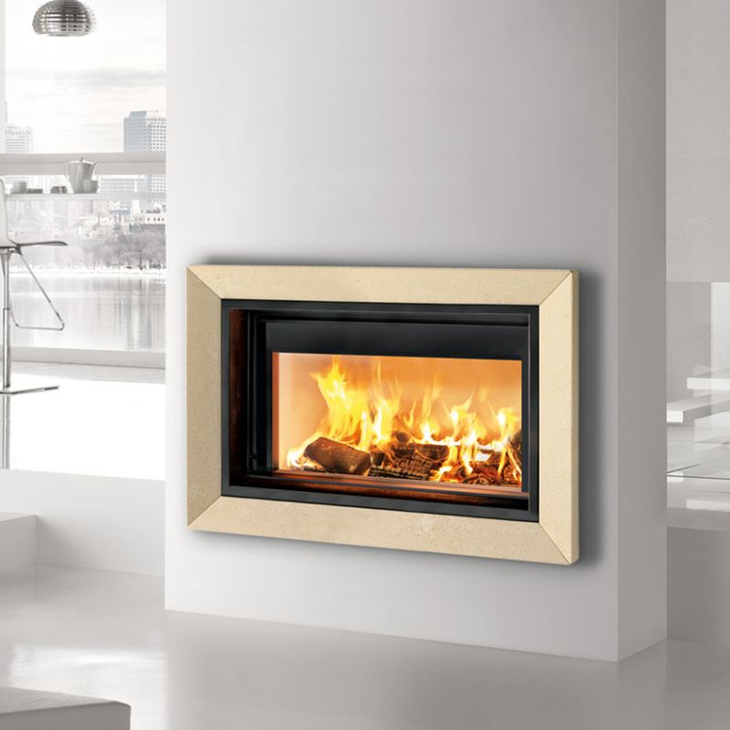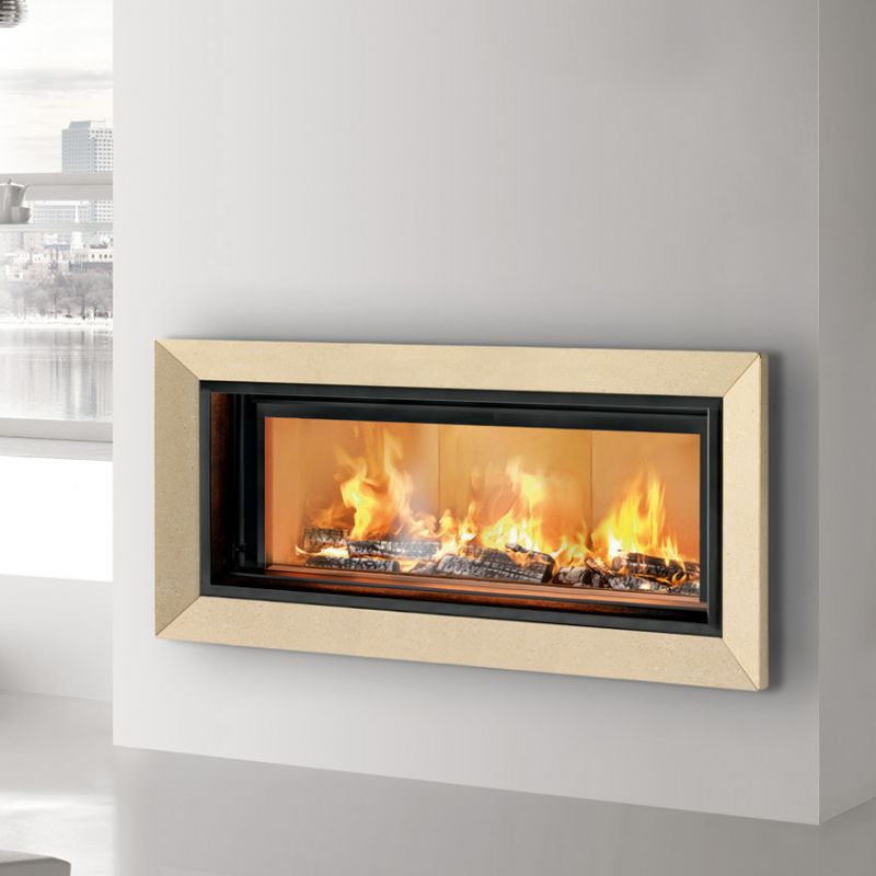caminetto a legna che si caratterizza dalla forma rettangolare a sviluppo orizzontale “extralarge”. La porta è interamente in vetro ceramico con meccanismo a saliscendi e apertura a ribalta per la pulizia. Camera di combustione rivestita in CMtech®, refrattario realizzato con spessori importanti; nella parte superiore il Catalizzatore-Frangifiamma è in CMtech®2, refrattario ceramico. Il caminetto può essere completato con due kit opzionali per distribuzione dell’aria calda sia nella versione naturale che ventilata.
