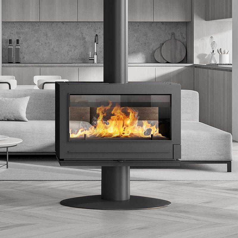Stufa a legna ad aria calda a convezione naturale. Struttura in ghisa verniciata grigio antracite. Uscita fumi superiore. Stufa bifacciale.
