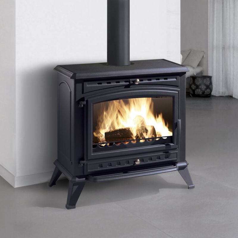 La stufa a legna dalle linee classiche ed eleganti. Seraphine RTC ha la struttura interamente in ghisa grigio antracite, con decorazioni geometriche sui fianchi e sul frontale che le conferiscono un aspetto armonioso. Il grande vetro anteriore permette un’ampia visione del fuoco. Uscita fumi superiore.