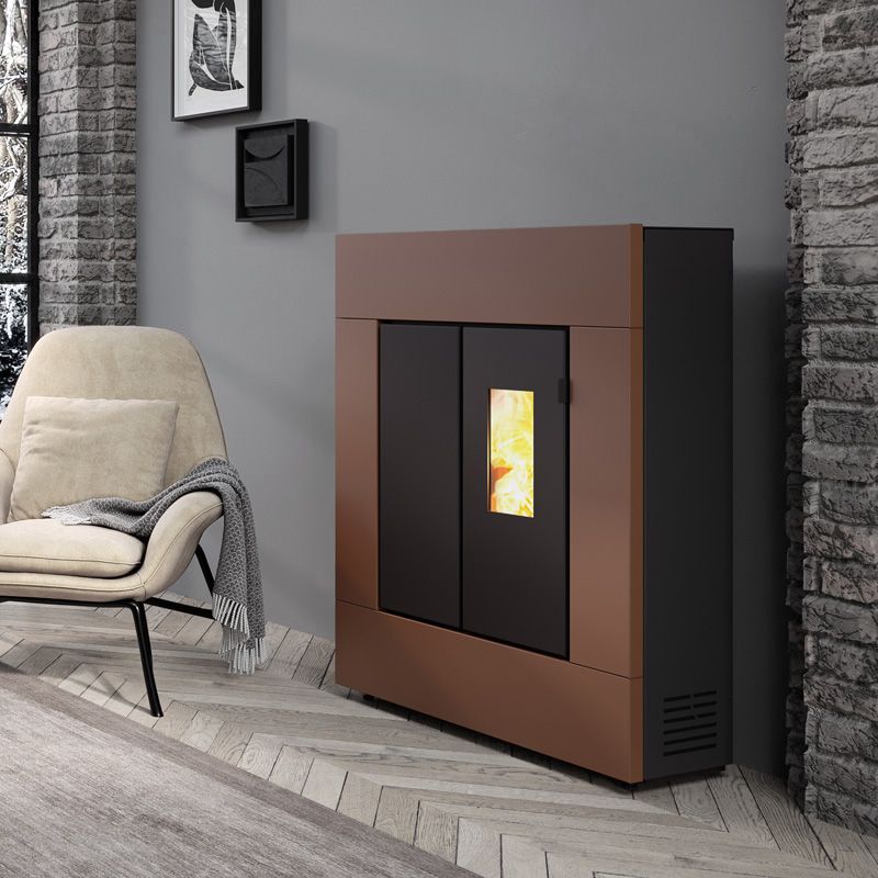 La stufa a pellet ACCIA è sottile, ermetica ad aria calda ventilata e canalizzabile con ventilazione SMART. Rivestimento e struttura in acciaio verniciato. Disponibile in bronzo.