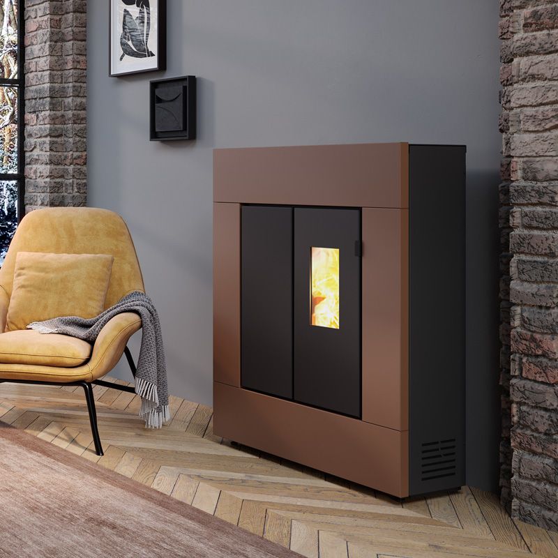 La stufa a pellet ACCIA è sottile, ermetica ad aria calda ventilata e canalizzabile con ventilazione SMART. Rivestimento e struttura in acciaio verniciato.