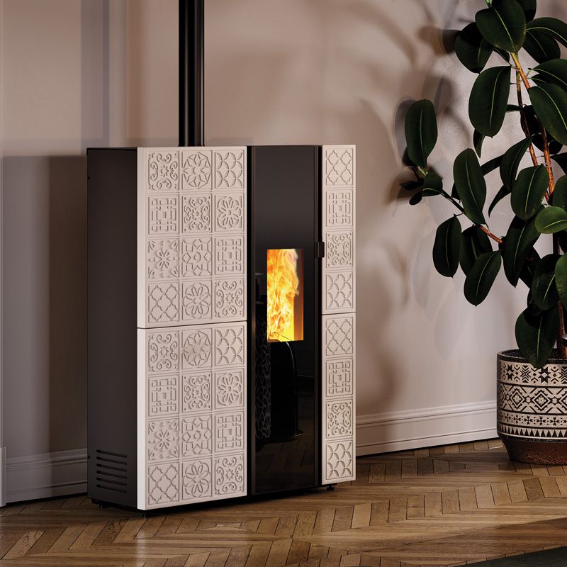 La stufa a pellet AZULEIA è sottile, ermetica ad aria calda ventilata e canalizzabile con ventilazione SMART intelligente che la rende estremamente silenziosa.