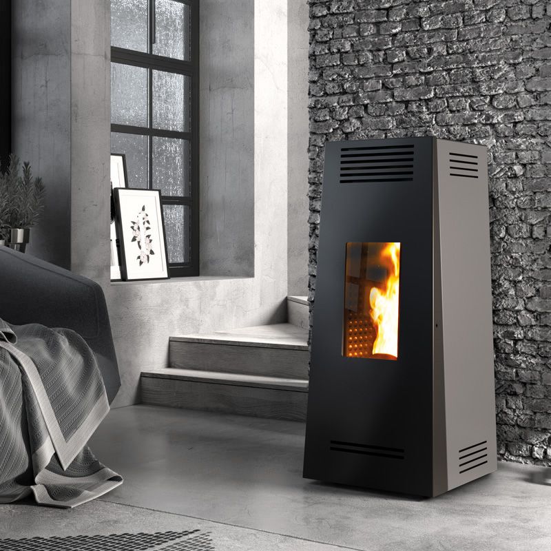 La forma trapezoidale, il frontale inclinato, le grandi asole contraddistinguono il design contemporaneo di Timbro Evo, progettata per inserirsi perfettamente in ambienti con arredamenti moderni e minimal. La struttura e il rivestimento sono in acciaio verniciato. La camera di combustione è decorata con un elegante motivo. Il rivestimento di Timbro Evo è disponibile nel colore grigio metallizzato.